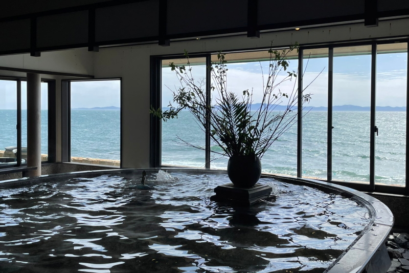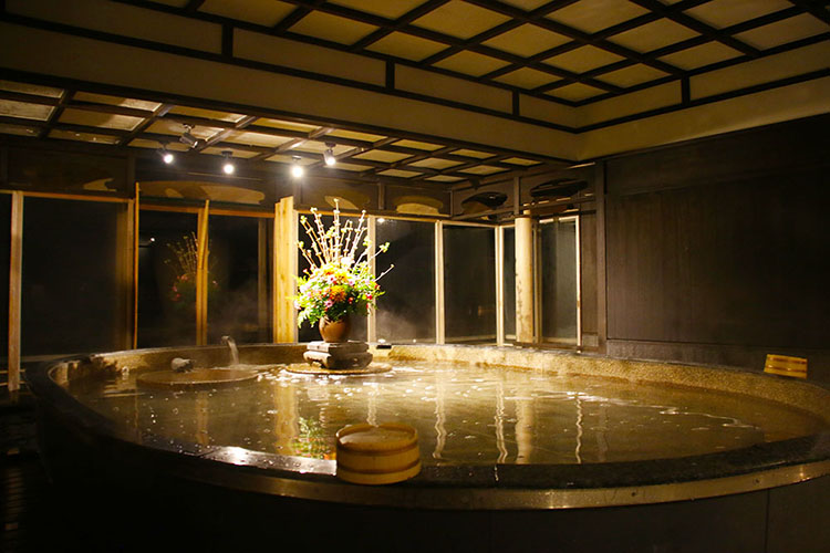 満月のように大きな湯舟には女将が施した生け花があり、優雅な気持ちの中、日常の疲れを癒すことができます。
